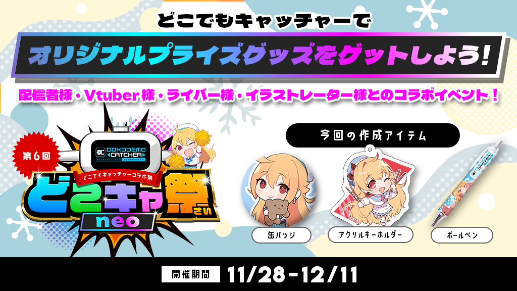 今回のどこキャ祭neoではご参加いただける配信者様・Vtuber様・ライバー様・歌い手様・イラストレーター様の「缶バッジ」「アクリルキーホルダー」「ボールペン」がどこでもキャッチャーに登場いたします。